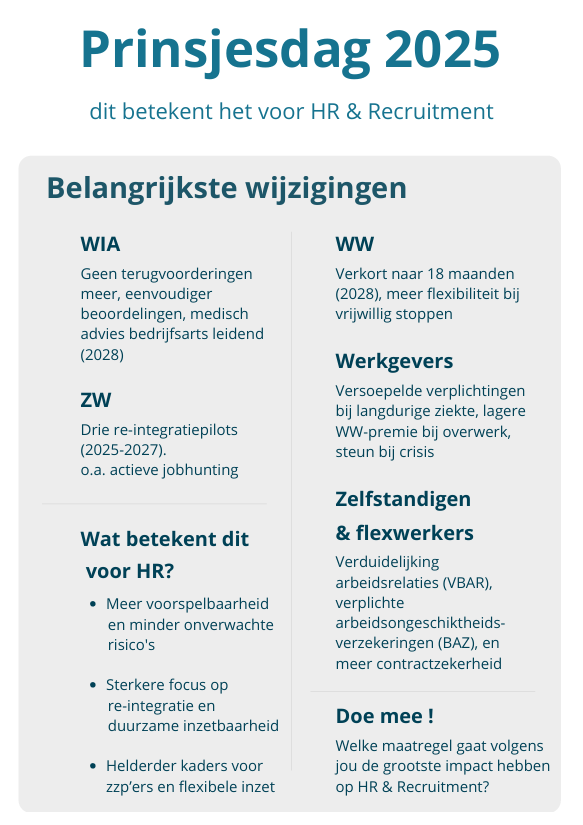 Prinsjesdag leverde dit jaar weer een uitgebreid pakket aan maatregelen op voor sociale zekerheid en de arbeidsmarkt. Veel daarvan raken direct aan ons vakgebied. We zetten de belangrijkste punten op een rij, én wat ze in de praktijk betekenen voor werkgevers, HR-professionals en zelfstandigen.